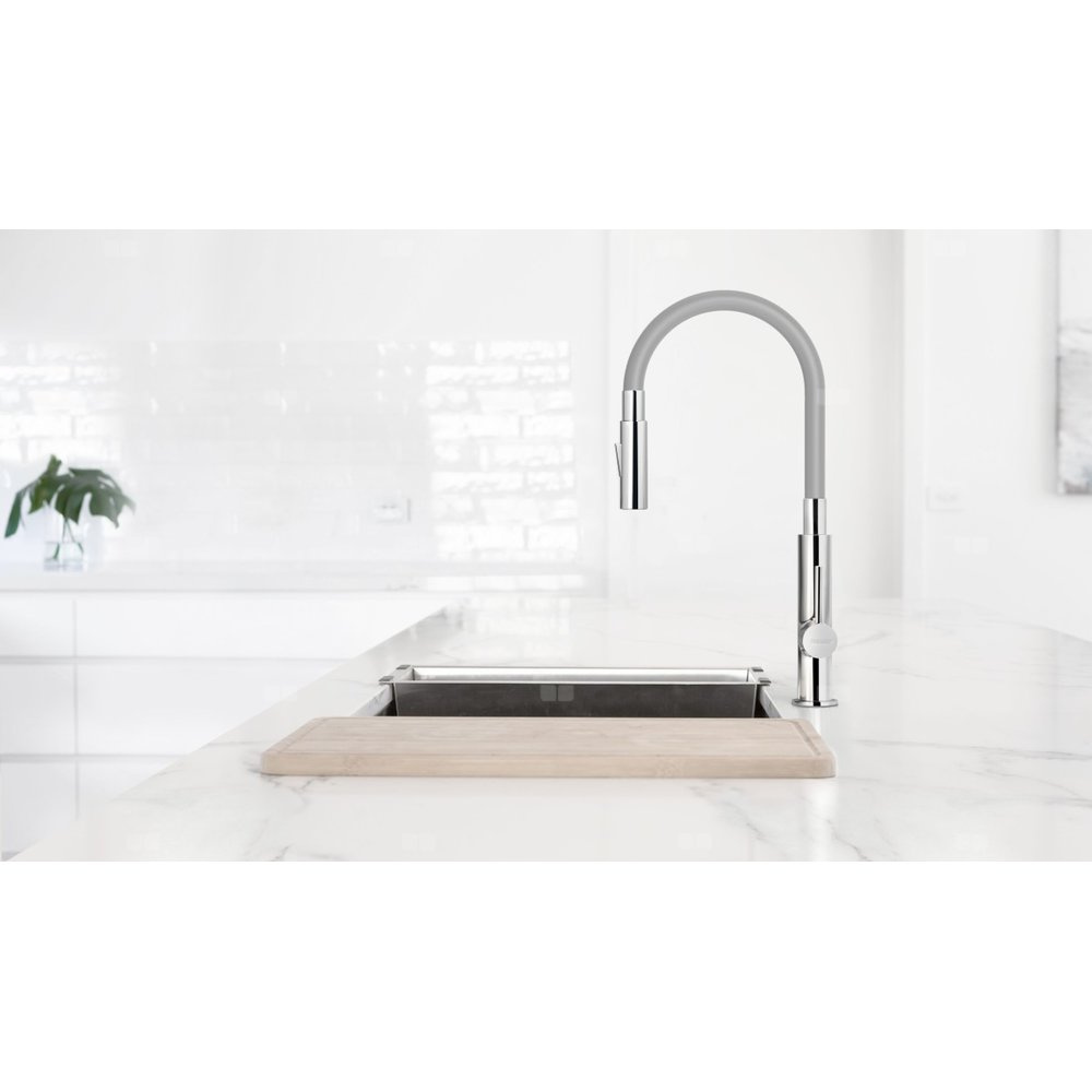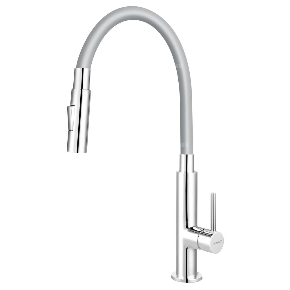 Bateria zlewozmywakowa o ciekawym, smukłym cylindrycznym kształcie. Posiada ruchomą, elastyczną wylewkę, której kształt możemy dowolnie formować. Dzięki temu rozwiązaniu bateria staję się bardziej praktyczna oraz łatwiejsza w użytkowaniu. Dwu-funkcyjna wylewka baterii daje nam również możliwość wyboru strumienia wody.