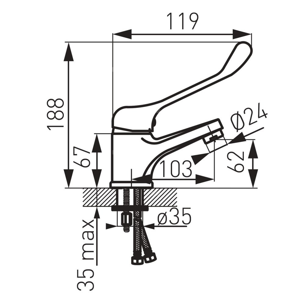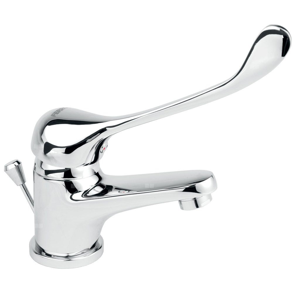 Bateria umywalkowa medyczna o charakterystycznym owalnym kształcie. Obły kształt korpusu i wylewki ułatwi utrzymanie baterii w czystości, krople wody nie będą osiadać, pozostawiając przy tym mniej osadu wapiennego. Produkt posiada uchwyt medyczny z przedłużoną dźwignią, który ułatwia regulacje strumienia oraz temperatury wody.