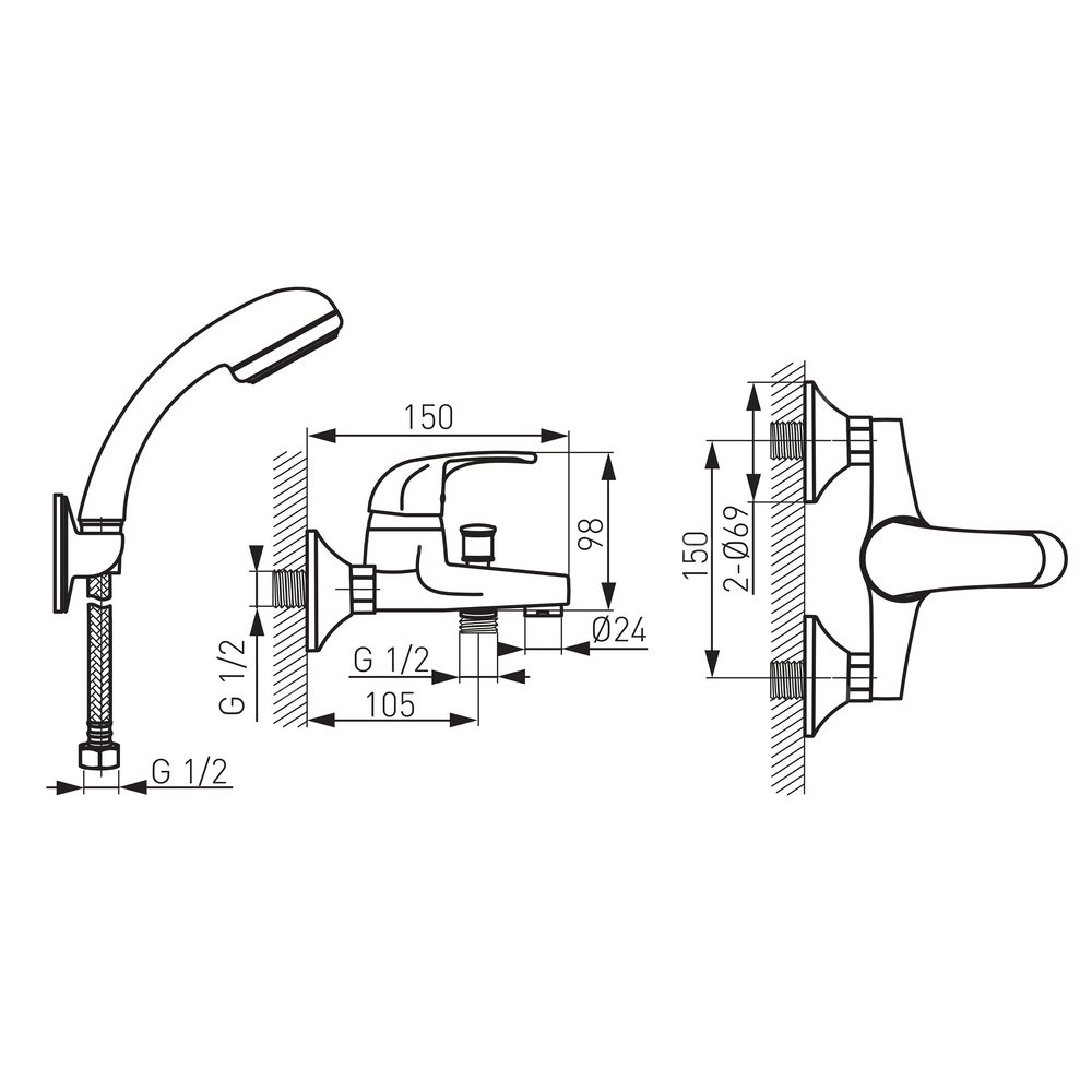 Bateria wannowa w klasycznym stylu, w komplecie z ergonomiczną rączką natryskową z funkcją strumienia typu deszcz, uchwytem oraz trwałym wężem prysznicowym.