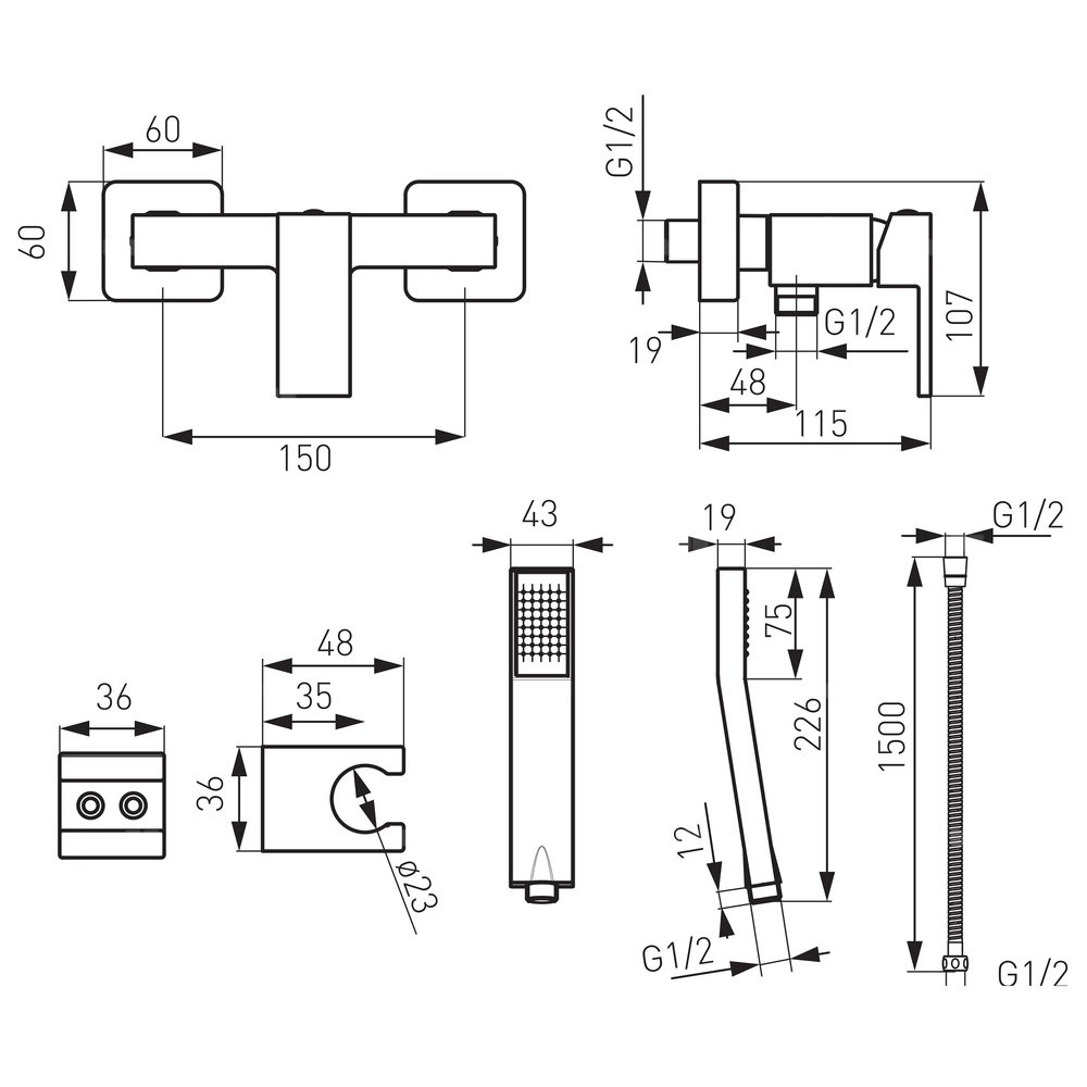 Charakterystyczna, kwadratowa bryła baterii sprawia, że jej dizajn doskonalone pasuje do nowoczesnego wnętrza. W komplecie znajdziemy prostokątną, modną 1-funkcyjną rączkę natryskową, trwały wąż prysznicowy w oplocie z metalu oraz uchwyt.