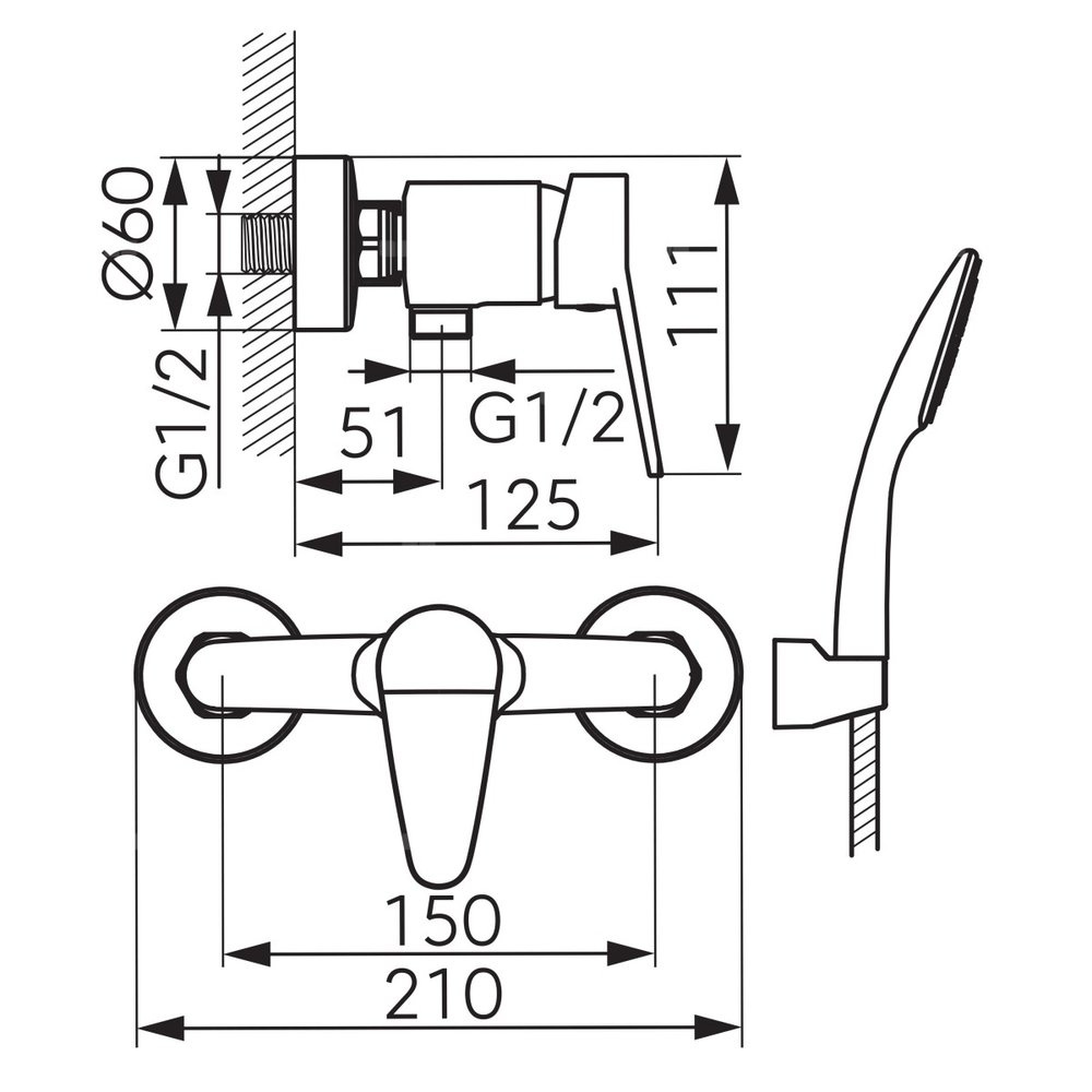 Bateria natryskowa w minimalistycznym stylu z zestawem natryskowym w komplecie. Obły kształt baterii ułatwia utrzymanie jej w czystości.