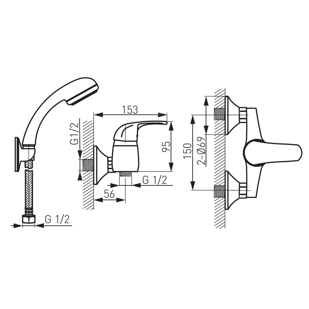 Bateria natryskowa w klasycznym stylu, w komplecie z ergonomiczną rączką natryskową z funkcją strumienia typu deszcz, uchwytem oraz trwałym wężem prysznicowym.