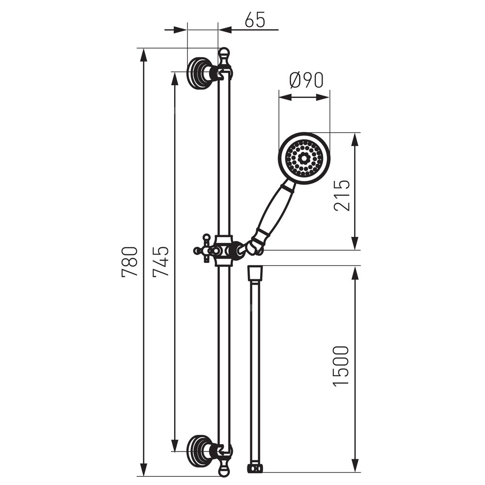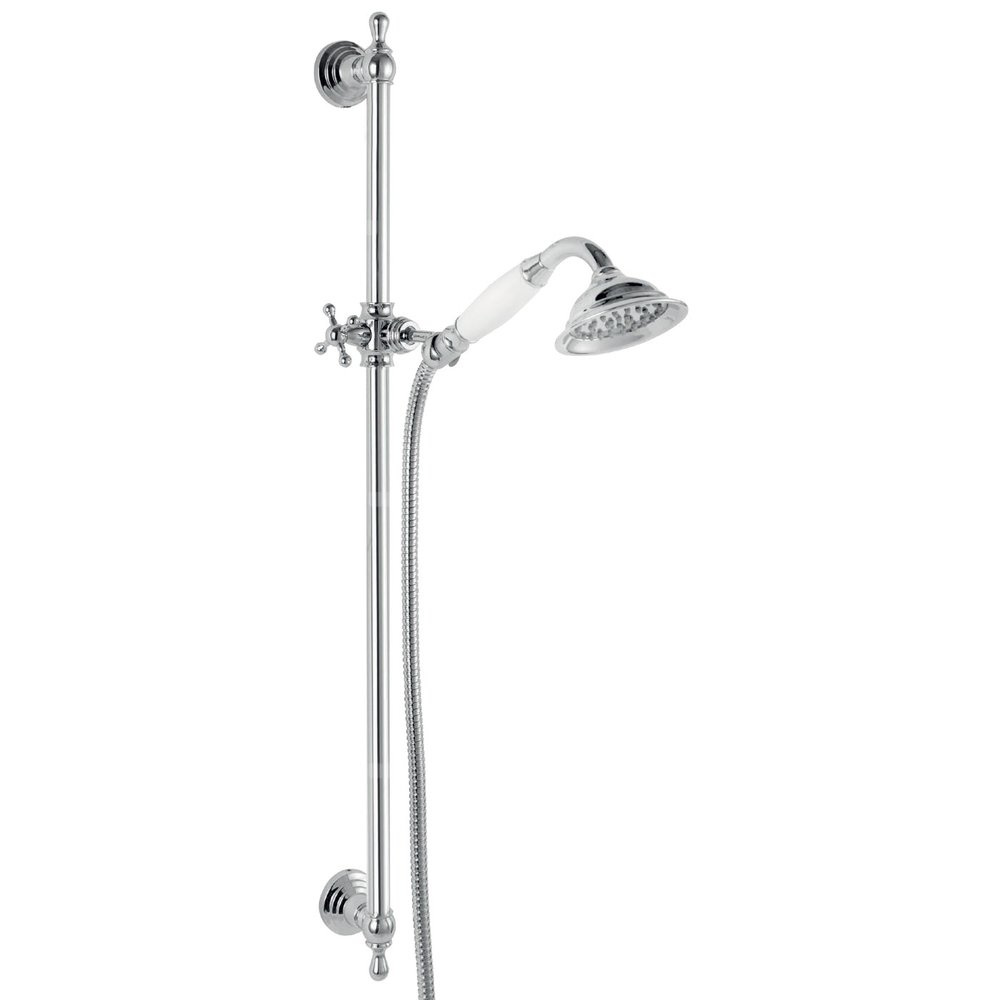 Zestaw natryskowy w stylu retro składający się z rączki natryskowej z funkcją strumienia typu deszcz, drążka, węża natryskowego. System Easy Clean ułatwi usuwanie osadu wapiennego w rączki natryskowej.