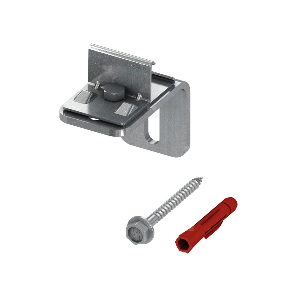 Kątownik mocujący do montażu konstrukcji TECE do ściany lub innej przegrody budowlanej. Zmontowany element ze stali ocynkowanej wraz z materiałami mocującymi.