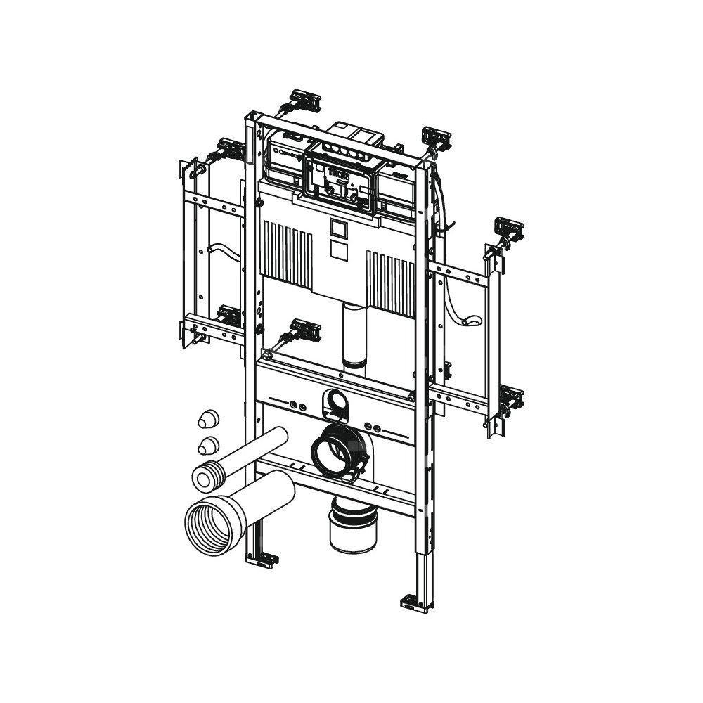 Moduł WC z instalacją przycisków spłukujących „easy fit”. Do mocowania na kształtownikach TECEprofil lub w ściankach UA podtynkowych lub przed ścianą murowaną. Do budownictwa bez barier z podwyższonym mocowaniem ceramiki. Moduł z bocznymi ramami stalowymi i przewodami instalacyjnymi do prowadzenia kabla, łącznie z materiałem mocującym.