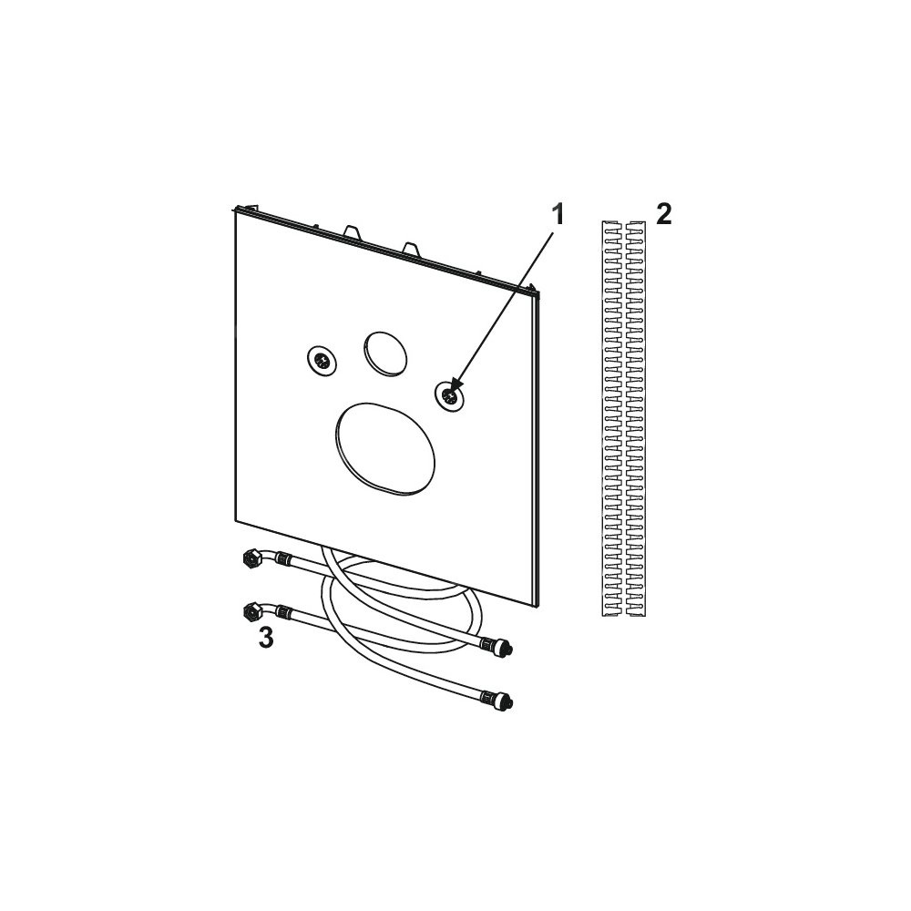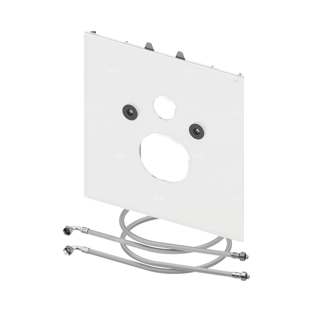Dolna obudowa szklana do połączenia z ceramiką WC TECEone z funkcją bidetu, z zestawem izolacji akustycznej i wężami w oplocie do podłączenia wody ciepłej i zimnej do konwencjonalnych zaworów kątowych.