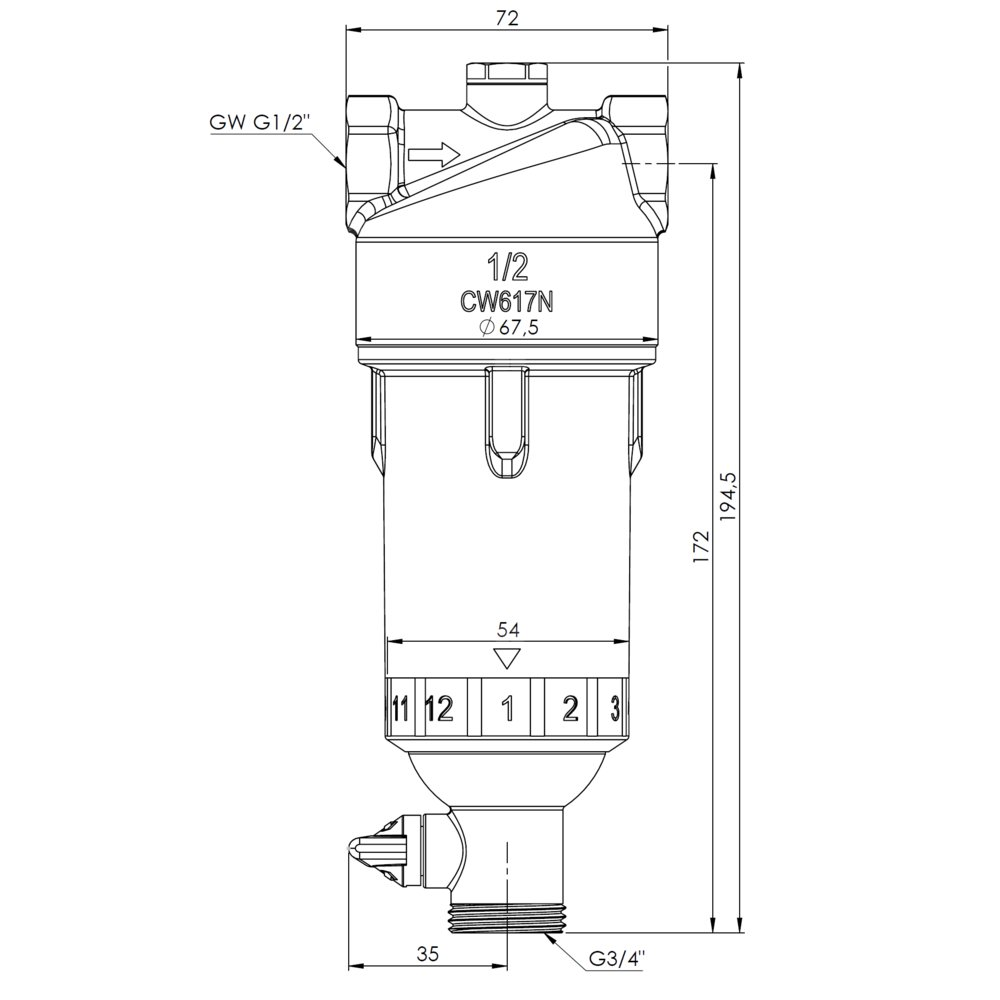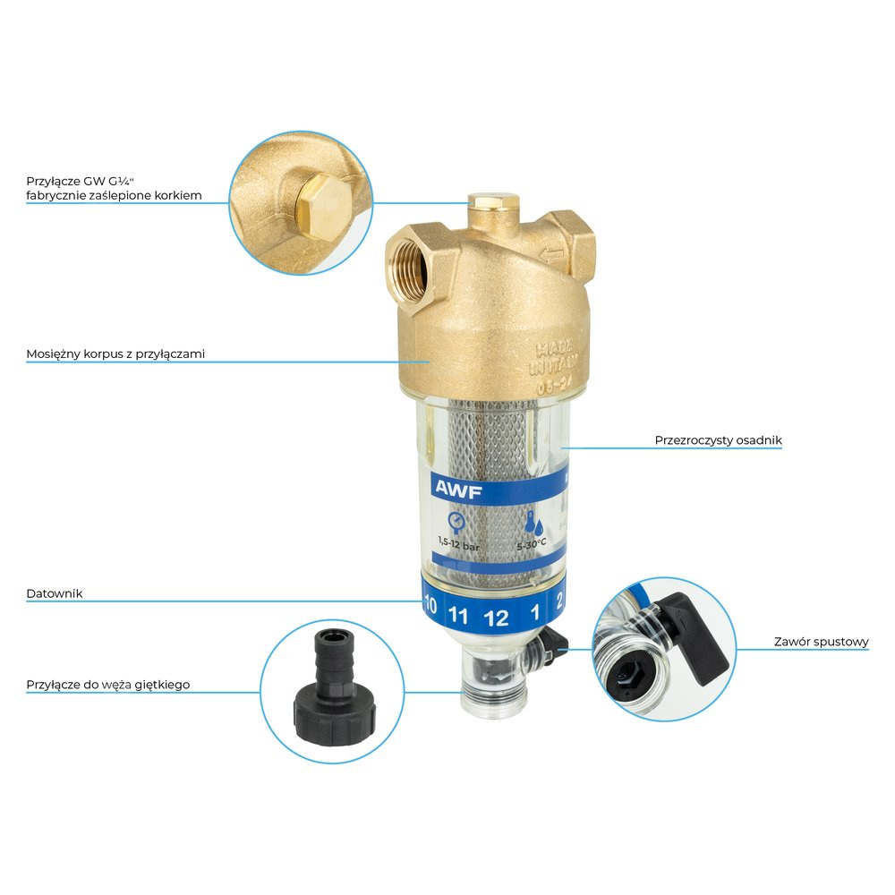 Korek G1/4" można zastąpić manometrem, w celu kontroli ciśnienia na wlocie do filtra.