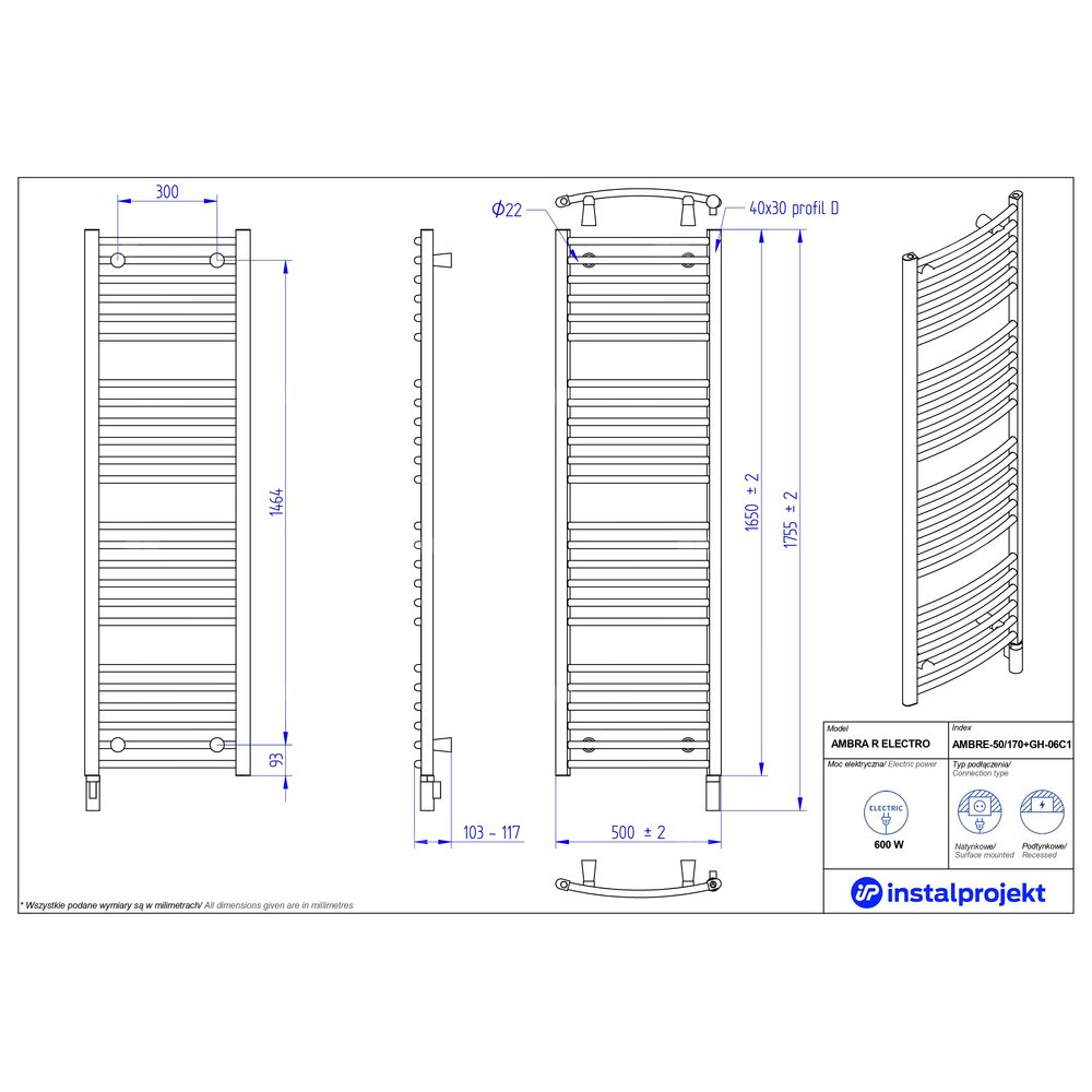 Grzejnik elektryczny (suszarka) INSTAL-PROJEKT AMBRA R ELECTRO, wym. 1650 (1755 z grzałką)/500 mm, kolor biały połysk, moc 600 W