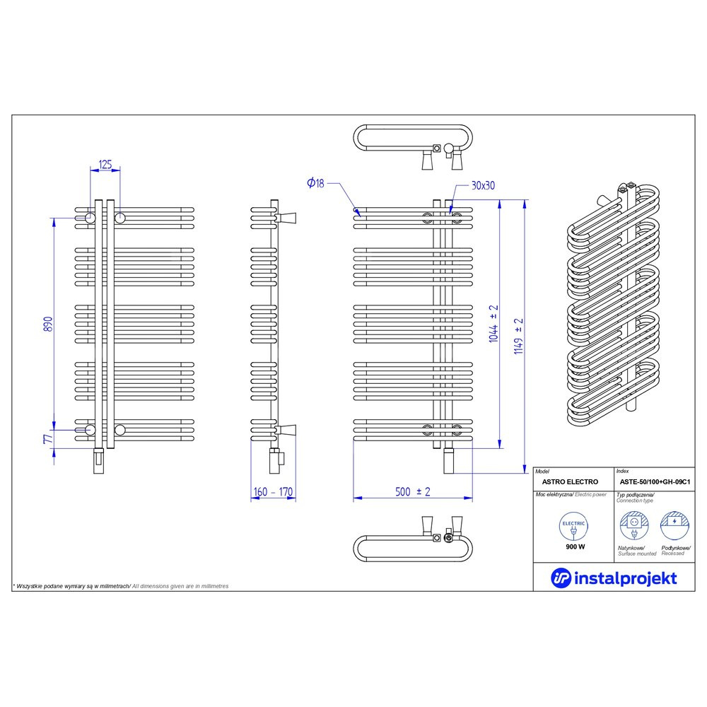 Grzejnik elektryczny (suszarka) INSTAL-PROJEKT ASTRO ELECTRO, wym. 1044 (1149 z grzałką)/500 mm, kolor biały połysk, moc 900 W