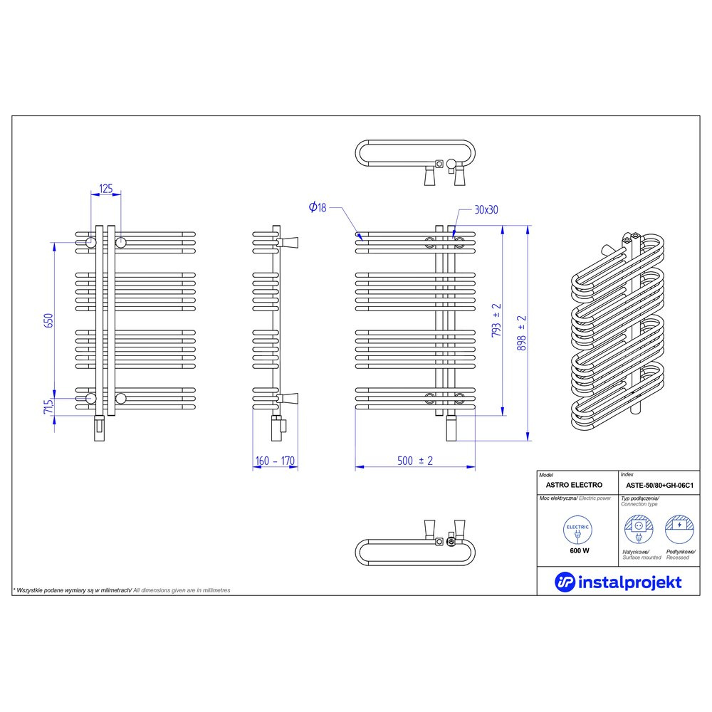 Grzejnik elektryczny (suszarka) INSTAL-PROJEKT ASTRO ELECTRO, wym. 793 (898 z grzałką)/500 mm, kolor biały mat, moc 600 W