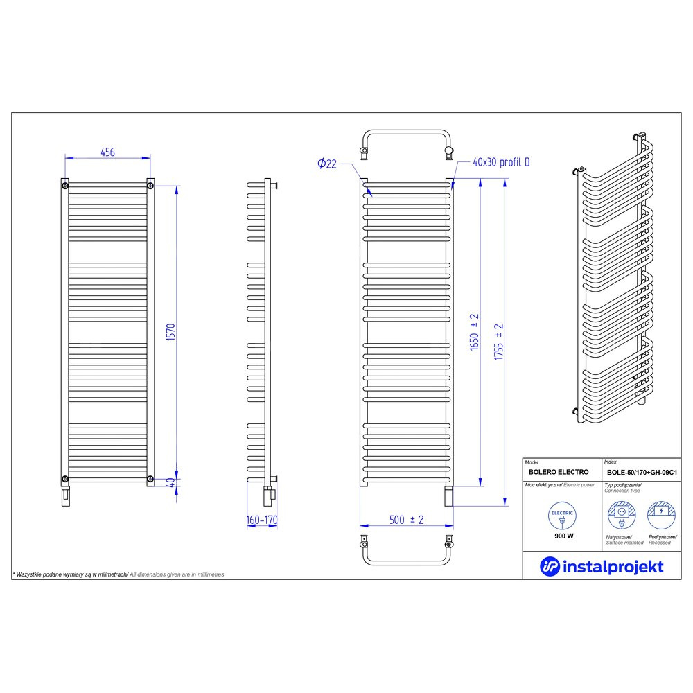 Grzejnik elektryczny (suszarka) INSTAL-PROJEKT BOLERO ELECTRO, wym. 1650 (1755 z grzałką)/500 mm, kolor biały połysk,  moc 900 W