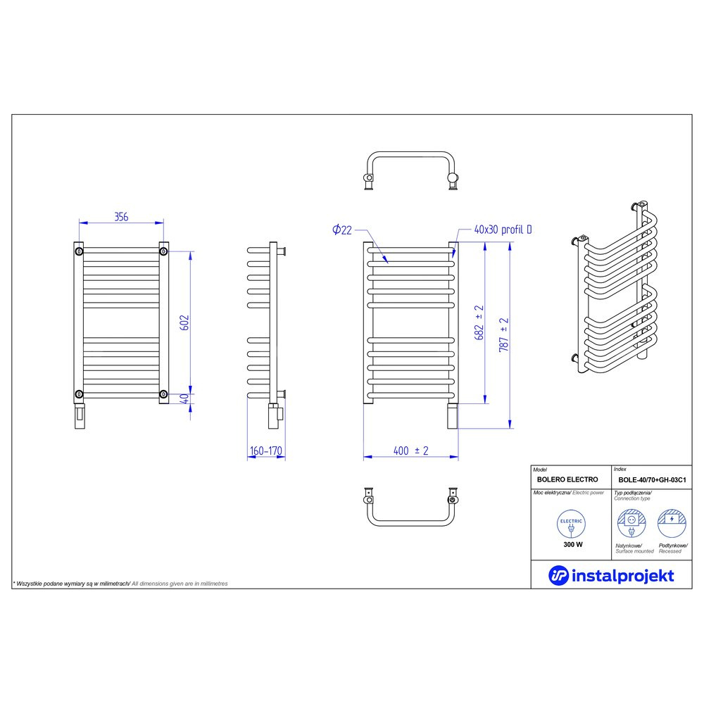 Grzejnik elektryczny (suszarka) INSTAL-PROJEKT BOLERO ELECTRO, wym. 682 (787 z grzałką)/400 mm, kolor biały połysk, moc 300 W
