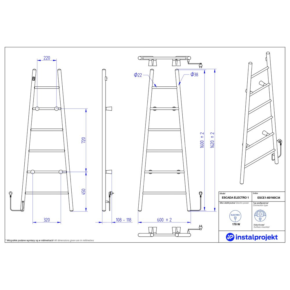 Grzejnik elektryczny (suszarka) INSTAL-PROJEKT ESCADA ELECTRO 1, wym. 1600/600 mm, kolor czarny mat, moc 170 W