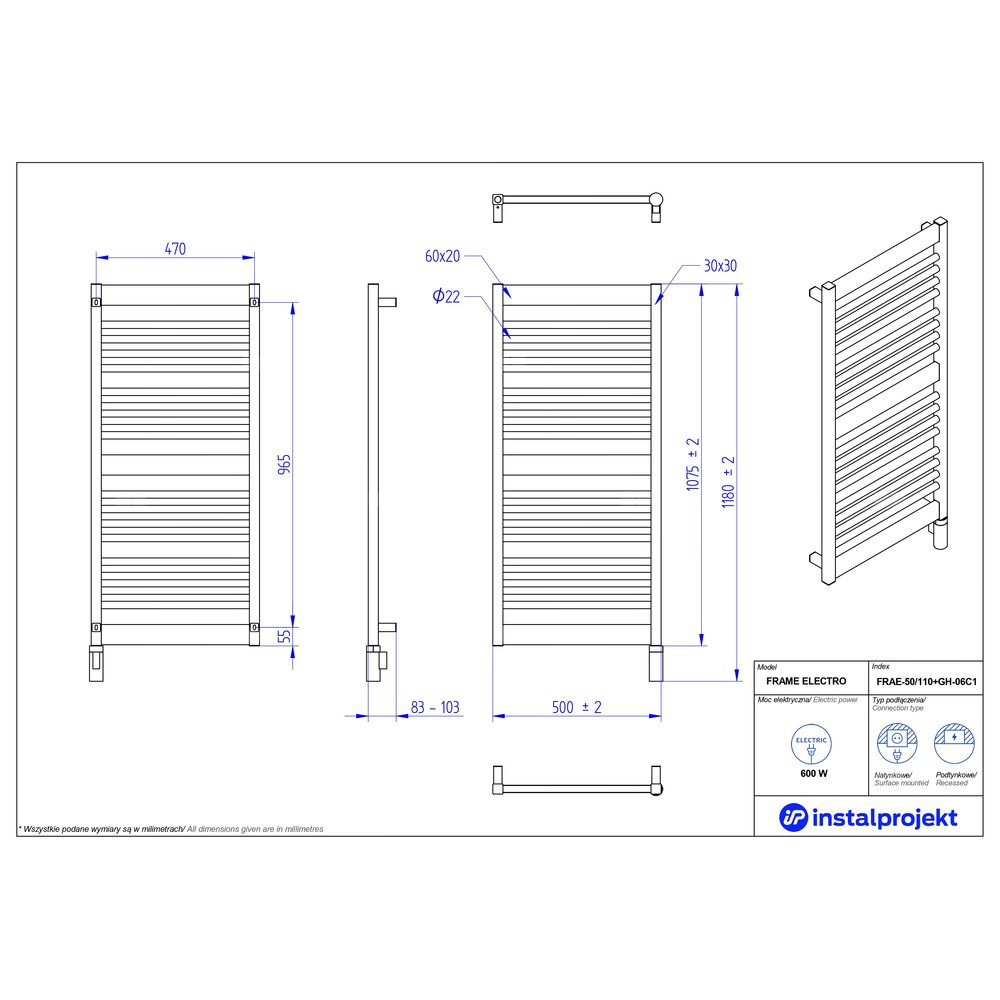 Grzejnik elektryczny (suszarka) INSTAL-PROJEKT FRAME ELECTRO, wym. 1075 (1180 z grzałką)/500 mm, kolor biały mat,  moc 600 W