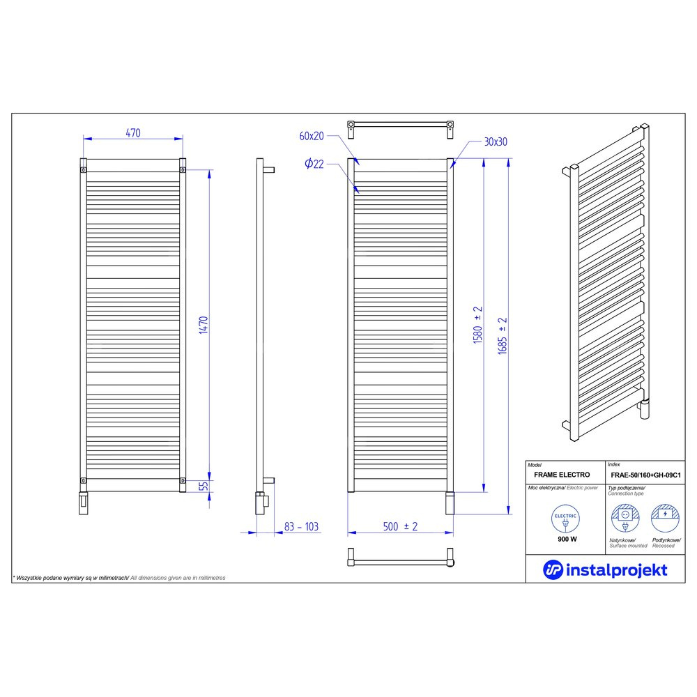 Grzejnik elektryczny (suszarka) INSTAL-PROJEKT FRAME ELECTRO, wym. 1580 (1685 z grzałką)/500 mm, kolor biały mat, moc 900 W