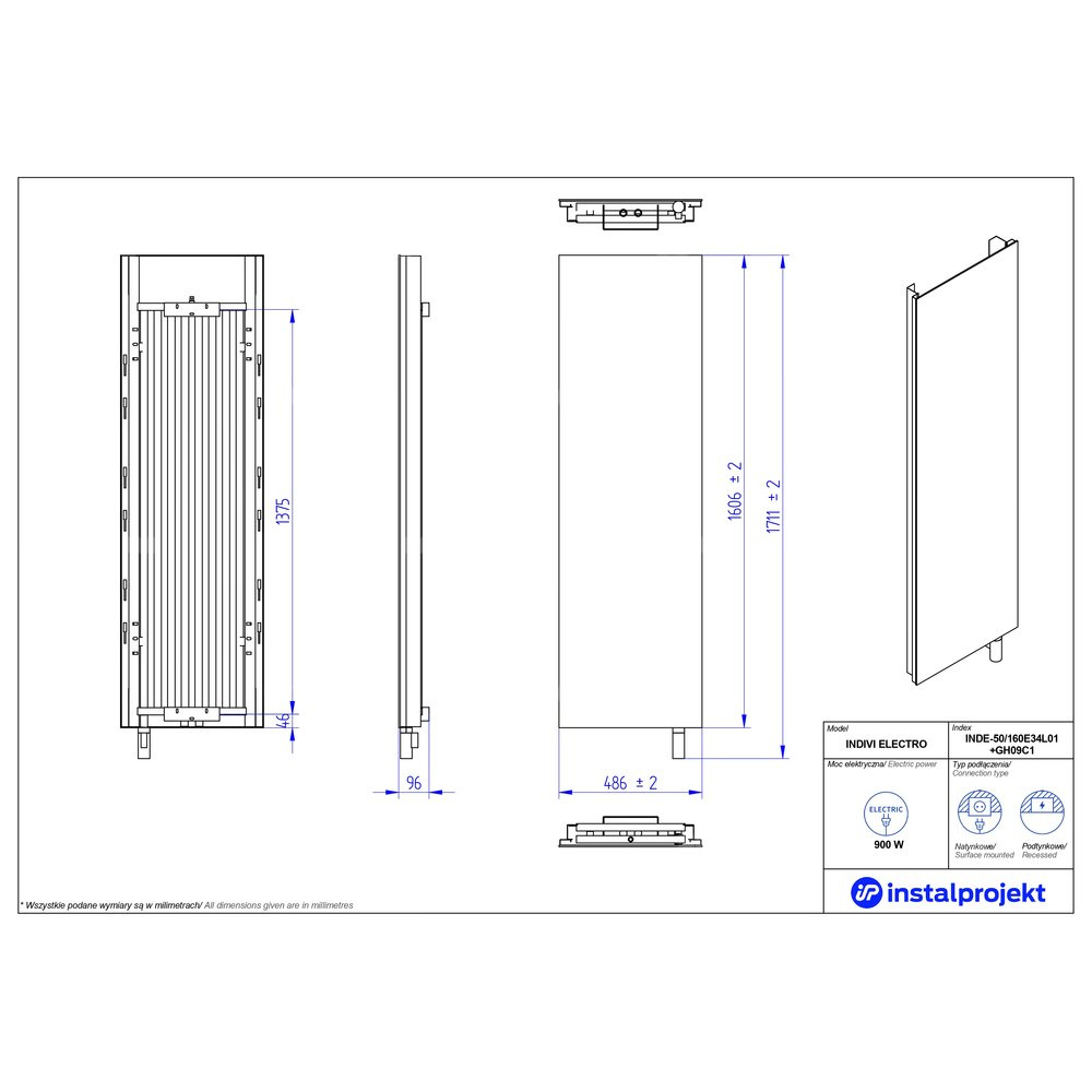 Grzejnik elektryczny (suszarka) INSTAL-PROJEKT Indivi Electro, wym. 1606 (1711 z grzałką)/486 mm, moc 900 W