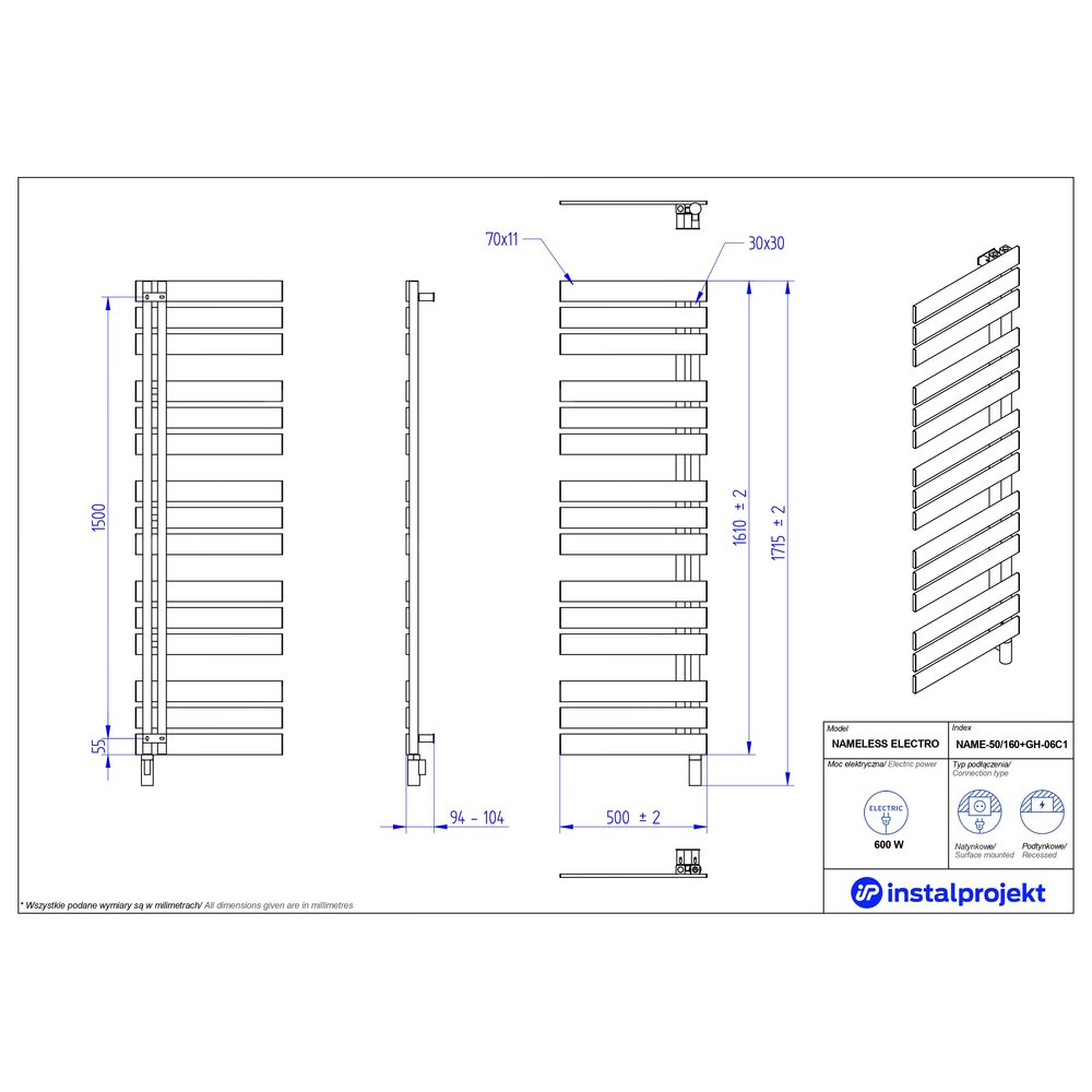 Grzejnik elektryczny (suszarka) INSTAL-PROJEKT NAMELESS ELECTRO, wym. 1610 (1715 z grzałką)/500 mm, kolor biały połysk,  moc 600 W