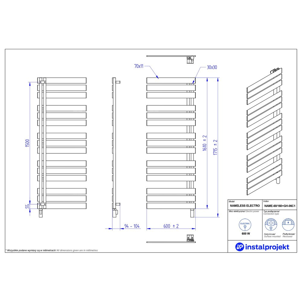 Grzejnik elektryczny (suszarka) INSTAL-PROJEKT NAMELESS ELECTRO, wym. 1610 (1715 z grzałką)/600 mm, kolor czarny mat, moc 600 W