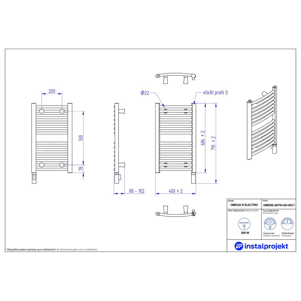 Grzejnik elektryczny (suszarka) INSTAL-PROJEKT OMEGA R ELECTRO, wym. 686 (791 z grzałką)/400 mm, kolor biały połysk, moc 300 W
