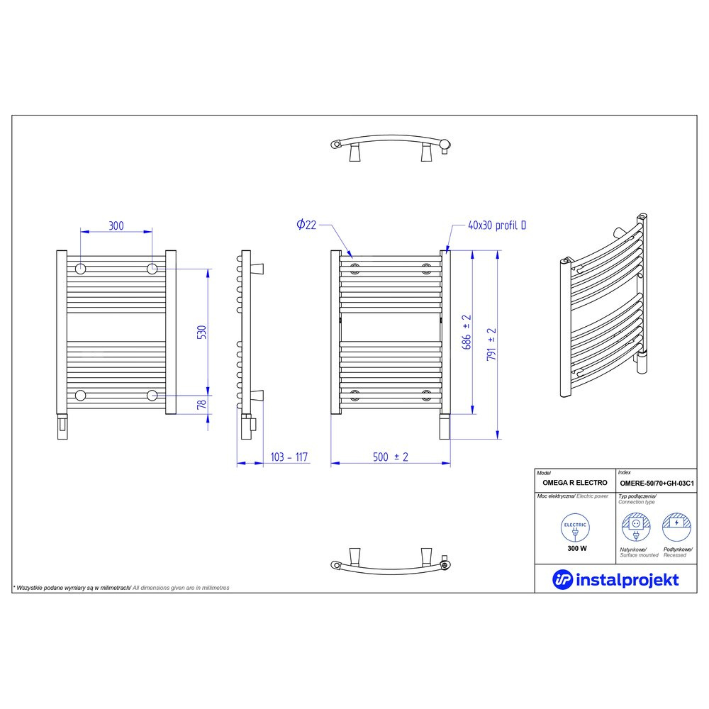 Grzejnik elektryczny (suszarka) INSTAL-PROJEKT OMEGA R ELECTRO, wym. 686 (791 z grzałką)/500 mm, kolor biały połysk,  moc 300 W
