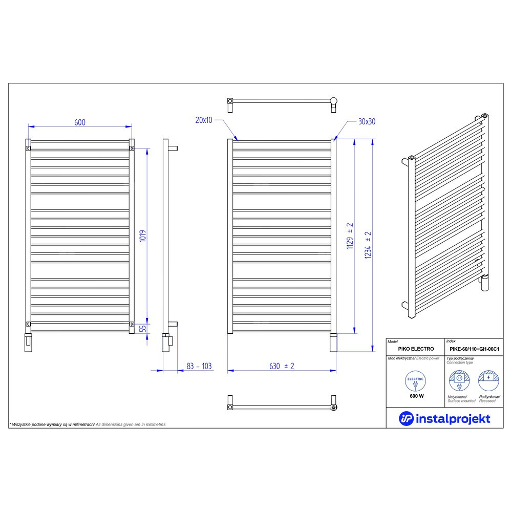 Grzejnik elektryczny (suszarka) INSTAL-PROJEKT PIKO ELECTRO, wym. 1129 (1234 z grzałką)/630 mm, kolor biały mat, moc 600 W