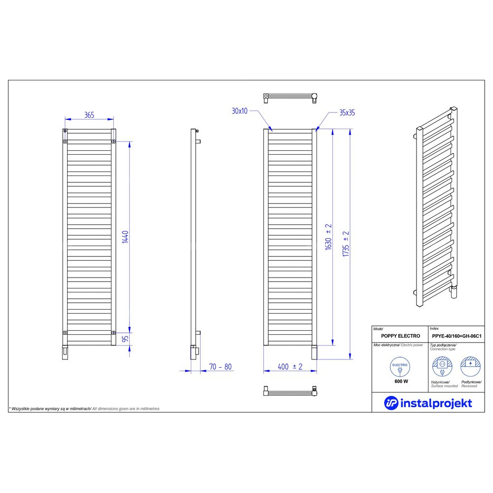 Grzejnik elektryczny (suszarka) INSTAL-PROJEKT POPPY ELECTRO, wym. 1630 (1735 z grzałką)/400 mm, kolor biały połysk,  moc 600 W