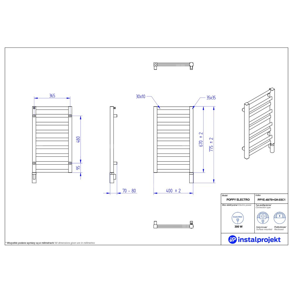 Grzejnik elektryczny (suszarka) INSTAL-PROJEKT POPPY ELECTRO, wym. 670 (775 z grzałką)/400 mm, kolor czarny mat,  moc 300 W