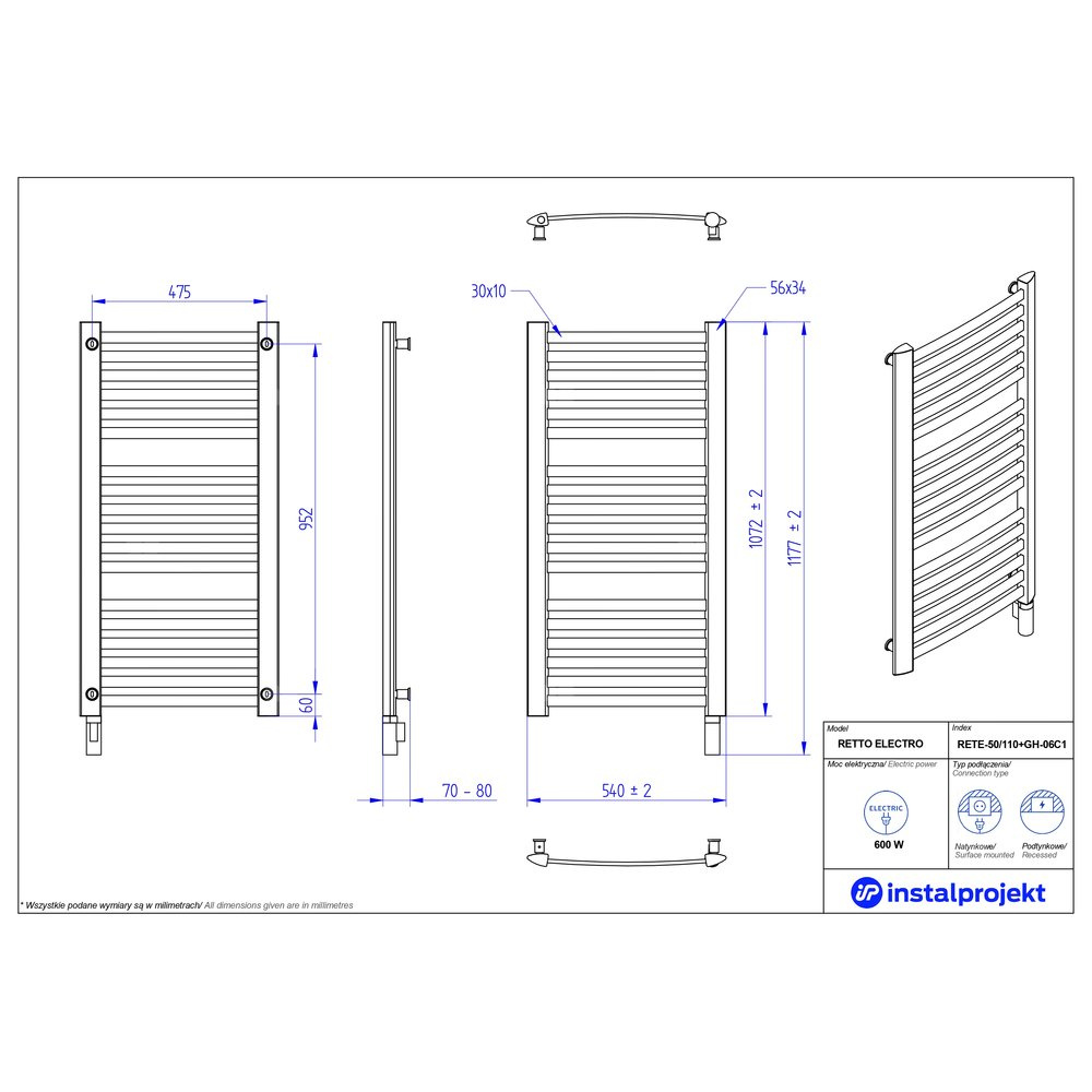 Grzejnik elektryczny (suszarka) INSTAL-PROJEKT RETTO ELECTRO, wym. 1072 (1177 z grzałką)/540 mm, kolor biały mat, moc 600 W