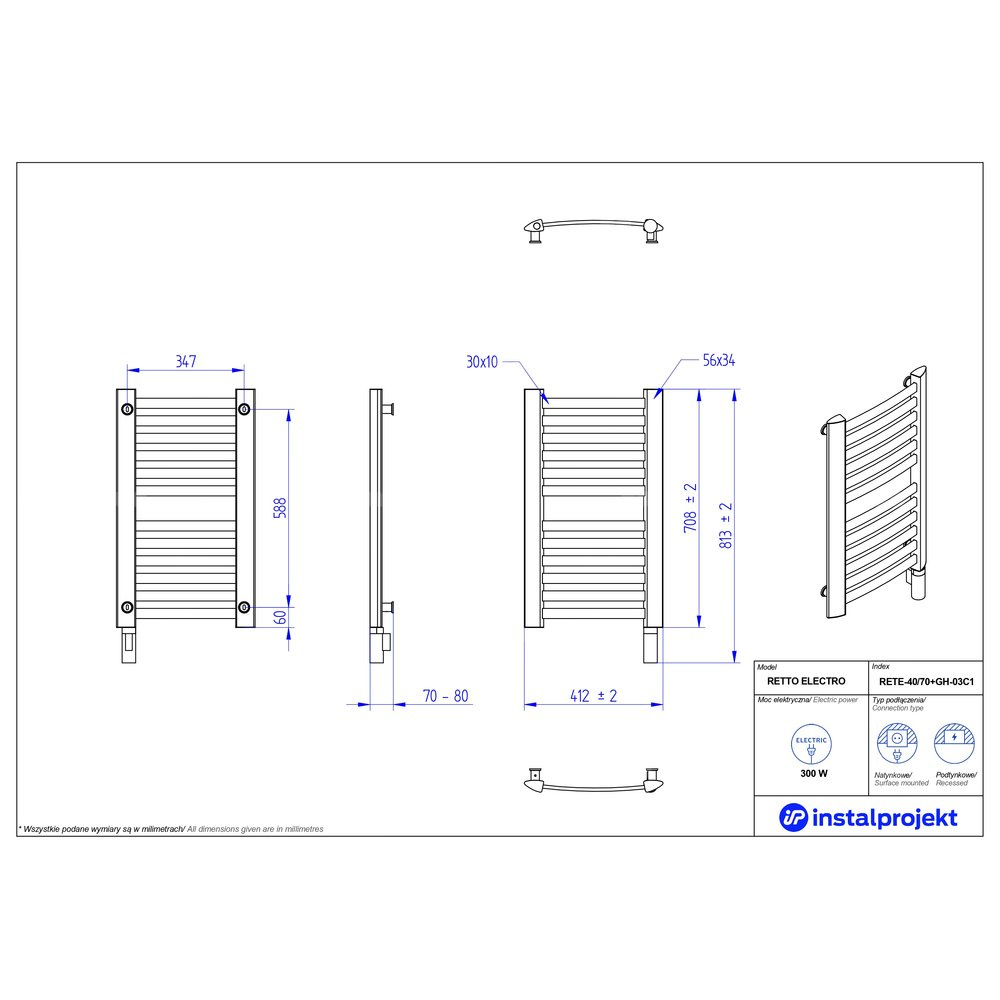 Grzejnik elektryczny (suszarka) INSTAL-PROJEKT RETTO ELECTRO, wym. 708 (813 z grzałką)/412 mm, kolor biały połysk,  moc 300 W