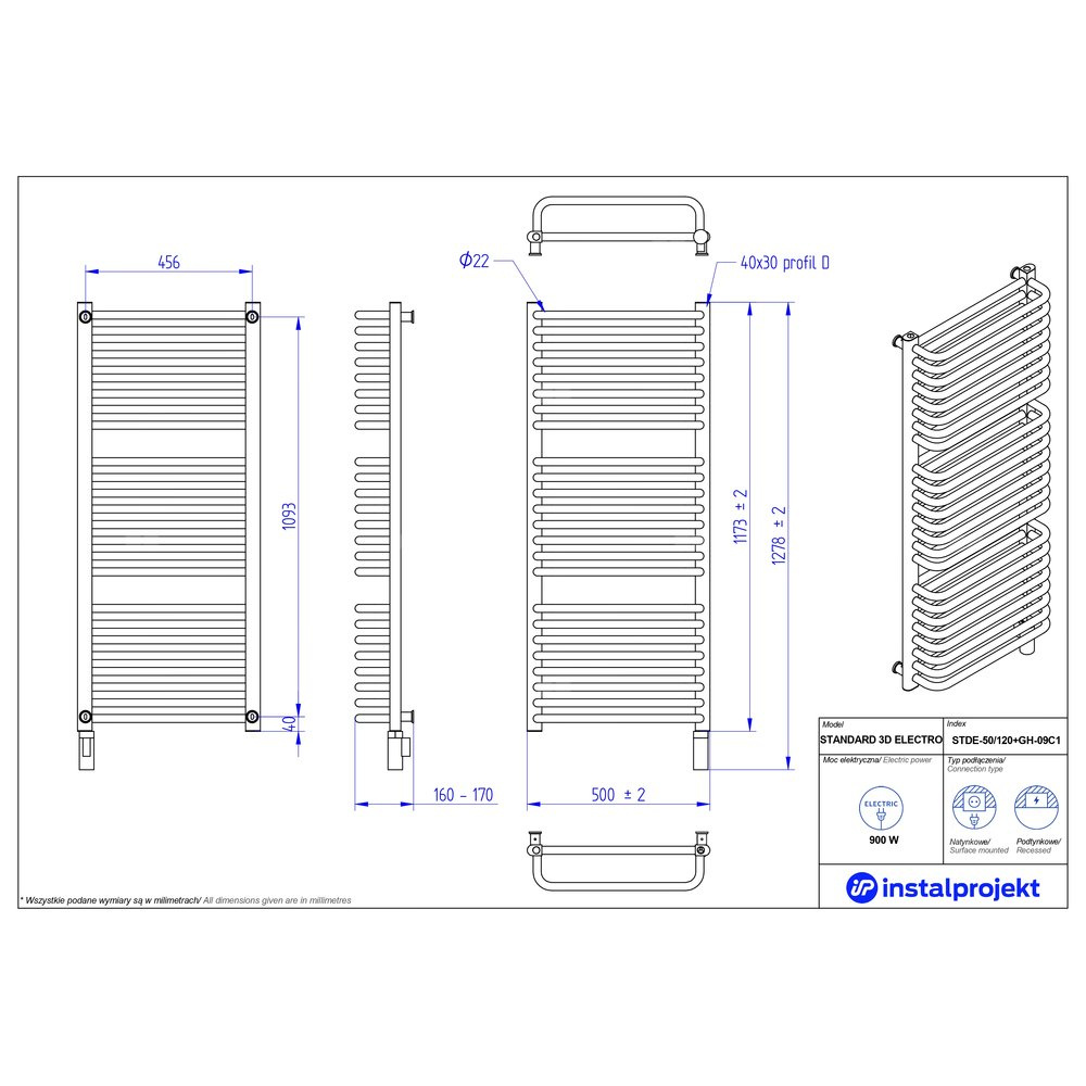 Grzejnik elektryczny (suszarka) INSTAL-PROJEKT STANDARD 3D ELECTRO, wym. 1173 (1278 z grzałką)/500 mm, kolor biały połysk,  moc 900 W