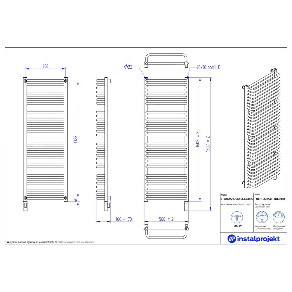 Grzejnik elektryczny (suszarka) INSTAL-PROJEKT STANDARD 3D ELECTRO, wym. 1402 (1507 z grzałką)/500 mm, kolor biały połysk, moc 900 W