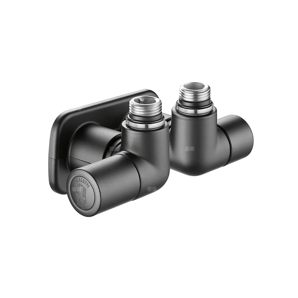 HIGH-STYLE para zaworów dekoracyjnych 3-osiowych. Przyłącze centralne Zestaw zawiera: - 3-osiowy zawór termostatyczny z pokrętłem przystosowany do montażu głowicy termostatycznej z serii 205; - 3-osiowy zawór odcinający; - dwie maskownice do montażu na ścianie, przyłącza: rozstaw otworów 50 mm. Przyłącze centralne. Wykonanie lewe. Do użycia ze złączkami z serii 437, 447, 681 i 679. podłącznie rury: G 1/2" A (ISO 228-1) GZ, wlot, lewy, Podłączenie do złączek Caleffi. podłączenie grzejnika: 23 p. 1,5, wylot, lewy. Maksymalne ciśnienie pracy: 10 bar. Zakres temperatury medium: 5–100 °C. Wykończenie: czarny (czarna, czarne). Kv zawór: 1,27 m³/h. Materiał: mosiądz.