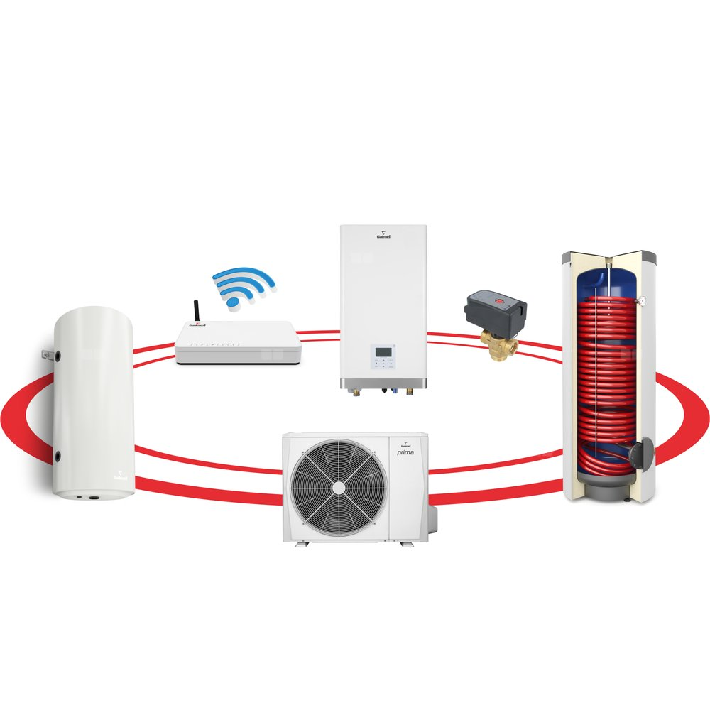 Hybrydowy system grzewczy: pompa ciepła PRIMA S 1F R32 6GT (typu SPLIT) + wymiennik c.w.u. do pomp ciepła TOWER GRAND 200 l + bufor 60 l + zawór trójdrogowy + komplet elektryczny + centrala Sinum Lite