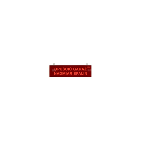Cechy użytkowe nowoczesna forma wizualna, czytelne napisy (standardowa wysokość liter 35mm); napis nieczytelny bez podświetlenia, ujawnia się po załączeniu zasilania; podświetlenie pulsujące, barwy czerwonej – zwracające uwagę obserwatora; źródło światła: wysokowydajne diody LED – wysoka trwałość i niezawodność, mały pobór mocy; zasilanie napięciem bezpiecznym 12V~ lub 24V~; TP-4.s(2)/TP-4.ds(2) - dwuczęściowa konstrukcja: tablica TP-4.As(2)/TP-4.dAs(2) + TPZ-4 zasilacz sieciowy 12V~ (w puszce przyłączeniowej z elastycznymi, płaskimi przepustami); podłączenie 4-żyłowe (TP-4.s2, TP-4.ds2) – możliwość podłączenia cichej/głośnej sygnalizacji akustycznej; możliwość wyłączenia sygnalizacji akustycznej; montaż naścienny (tablica jednostronna) lub podwieszany (tablica dwustronna). Standardowe napisy H1 - “NIE WCHODZIĆ NADMIAR SPALIN” H2 - “OPUŚCIĆ GARAŻ NADMIAR SPALIN” H3 - “NIE WJEŻDŻAĆ NADMIAR SPALIN” H4 - „WYCIEK AUTOGAZU ZACHOWAĆ OSTROŻNOŚĆ” H5 - „UWAGA ! NADMIAR SPALIN” Inne napisy H0 - napis dowolny, według specyfikacji (2 rzędy napisów, 20 znaków max. na rząd) Sygnalizacja optyczna pulsująca, czerwona Napis informacyjny OPUŚCIĆ GARAŻ NADMIAR SPALIN Sygnalizacja akustyczna 60 dB/1m lub 75 dB/1m Napięcie zasilania 12/24V~ Wymiary 555 x 155 x 23 mm