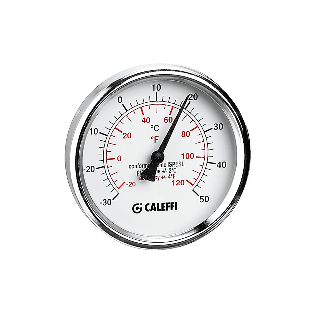 Termometr do instalacji chłodniczych Zgodny z normami INAIL (wcześniej ISPESL) Z tuleją. Przyłącze: G 1/2" A (ISO 228-1) GZ, podłączenie środkowe. Wymiary/ Średnice: Ø 80 mm. Długość tulei: 45 mm. Klasa dokładności: Termometr UNI 2. Skala termometru: -30–50 °C.