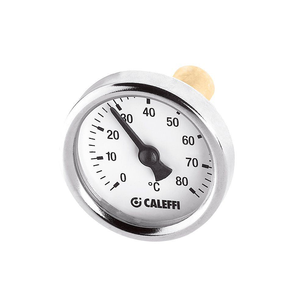 Termometr z gniazdem. Przyłącze: G 1/4" A (ISO 228-1) GZ, wlot. Wymiary/ Średnice: Ø 40 mm. Skala termometru: 0–80 °C.
