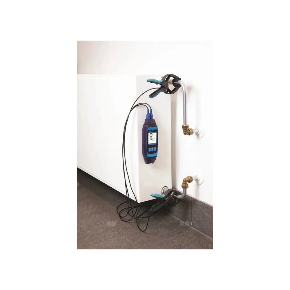 Zestaw umożliwia określanie temperatury na zasilaniu i powrocie pompy ciepła za pomocą dwóch szczypcowych czujników temperatury.