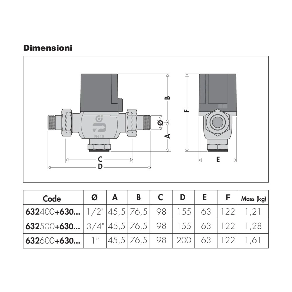 Dwudrożny zawór strefowy, tłokowy Przyłącze: G 1/2" A (ISO 228-1) GZ. Maksymalne ciśnienie pracy: 10 bar. Zakres temperatury medium: -5–95 °C. △p max.: 1 bar. Kv przelot: 5,10 m³/h.