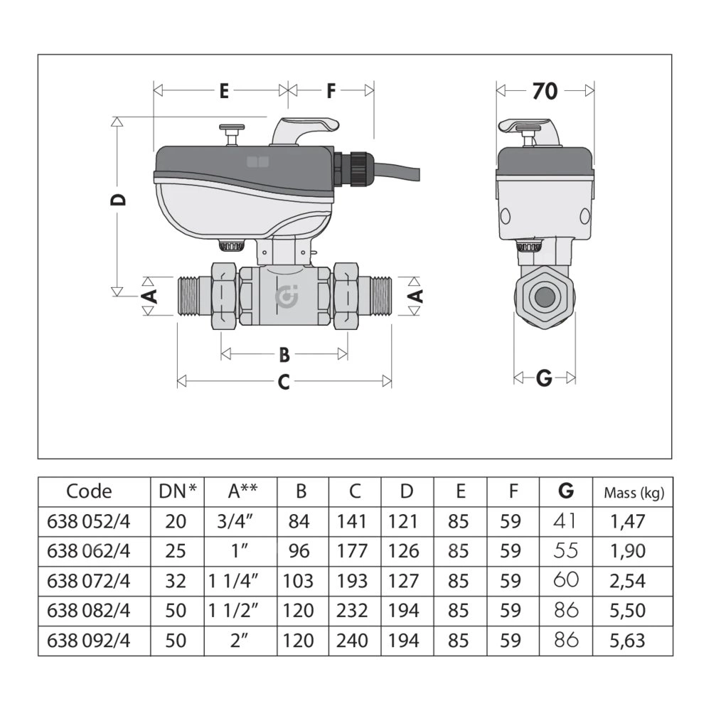 Dwudrożny zawór kulowy z napędem Z mikroprzełącznikiem pomocniczym. Przyłącze: R 3/4" (EN 10226-1) GZ. Maksymalne ciśnienie pracy: 16 bar. Zakres temperatury medium: -10–110 °C. Zakres temperatury otoczenia: -10–55 °C. Zasilanie elektryczne: 24 V (AC). Pobór mocy: 6 VA. Stopień ochrony: IP 65. Styk mikroprzełącznika pomocniczego (230 V): 6 (2) A. △p max.: 10 bar. Kv: 17 m³/h. Czas zadziałania: 50 s (obrót 90°).