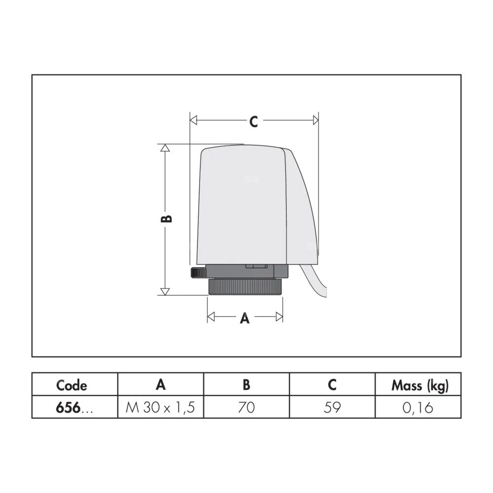 Siłownik termoelektryczny. Z mikroprzełącznikiem pomocniczym Ze wskaźnikiem pozycji otwarcia. Montaż przy użyciu szybkozłącza, z przyłączem wciskowym. Normalnie zamknięty. Do zaworów serii 338, 339, 401, 402, 425, 426, 421, 422, 455, 456, 220, 221, 222, 223, 224, 225, 226, 227, 230, 231, 232, 233, 234, 237, 676, 677, 678 i rozdzielaczy serii 670, 671, 668.S1,664, 665. Zakres temperatury otoczenia: 0–50 °C. Zasilanie elektryczne: 230 V (AC). Pobór mocy: 3 W. Stopień ochrony: IP 54. Długość przewodu zasilająego: 0,80 m. Styk mikroprzełącznika pomocniczego (230 V): 0,8 A. Prąd rozruchowy: ≤ 1 A.