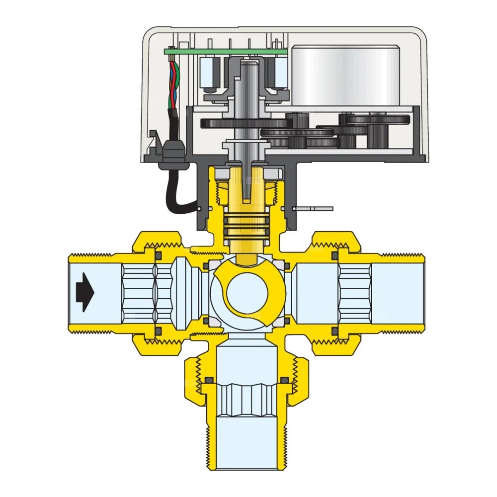 Trójdrożny kulowy zawór strefowy z napędem, wersja z obejściem Z mikroprzełącznikiem pomocniczym W zestawie z siłownikiem ze sterowaniem 3-punktowym Przyłącze: G 1" A (ISO 228-1) GZ. Maksymalne ciśnienie pracy: 10 bar. Zakres temperatury medium: -5–110 °C. Zakres temperatury otoczenia: 0–55 °C. Zasilanie elektryczne: 24 V (AC). Pobór mocy: 4 VA. Stopień ochrony: IP 40 (w pozycji poziomej), IP 44 (w pozycji pionowej). Długość przewodu zasilająego: 1 m. Styk mikroprzełącznika pomocniczego (230 V): 0,8 A. △p max.: 10 bar. Kv przelot: 10,3 m³/h. Kv obejście: 1,8 m³/h. Czas zadziałania: 40 s (obrót 90°).
