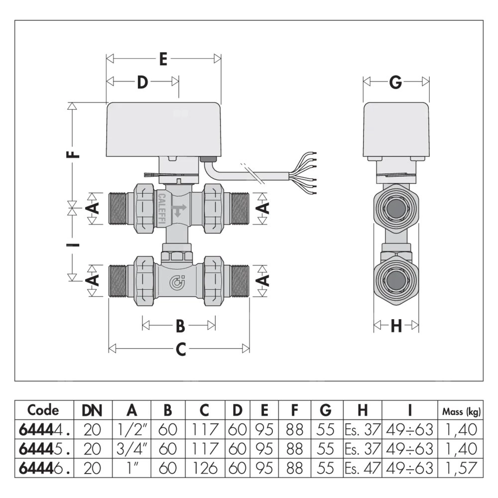 Trójdrożny zawór kulowy, z napędem z trójnikiem obejściowym Z mikroprzełącznikiem pomocniczym Z siłownikiem ze sterowaniem 3-punktowym Trójnik z dyszą U6. Regulowana odległość środkowych otworów wylotowych od 49 do 63 mm. Przyłącze: G 3/4" A (ISO 228-1) GZ. Maksymalne ciśnienie pracy: 10 bar. Zakres temperatury medium: -5–110 °C. Zakres temperatury otoczenia: 0–55 °C. Zasilanie elektryczne: 230 V (AC). Pobór mocy: 4 VA. Stopień ochrony: IP 40 (w pozycji poziomej), IP 44 (w pozycji pionowej). Długość przewodu zasilająego: 1 m. Styk mikroprzełącznika pomocniczego (230 V): 0,8 A. △p max.: 10 bar. Kv przelot: 10,3 m³/h. Kv obejście: 1,2 m³/h. Czas zadziałania: 40 s (obrót 90°).