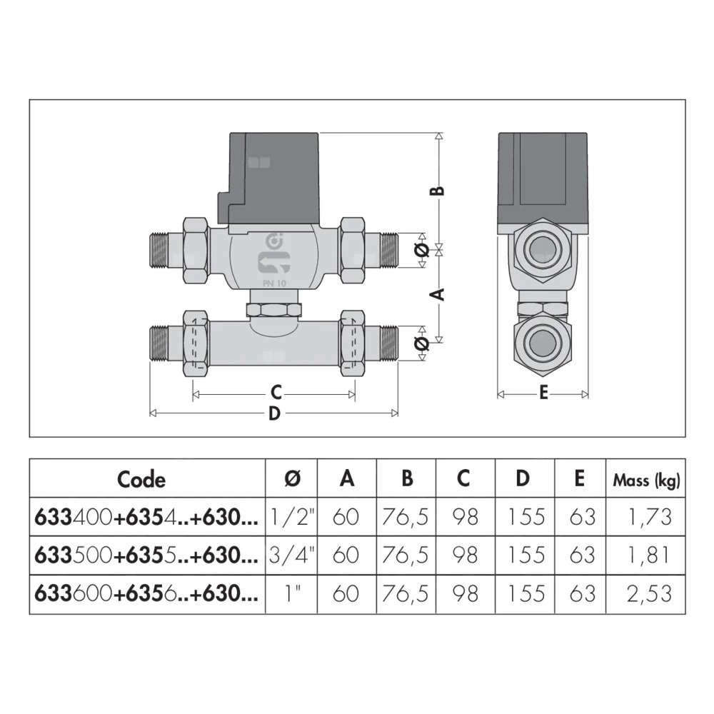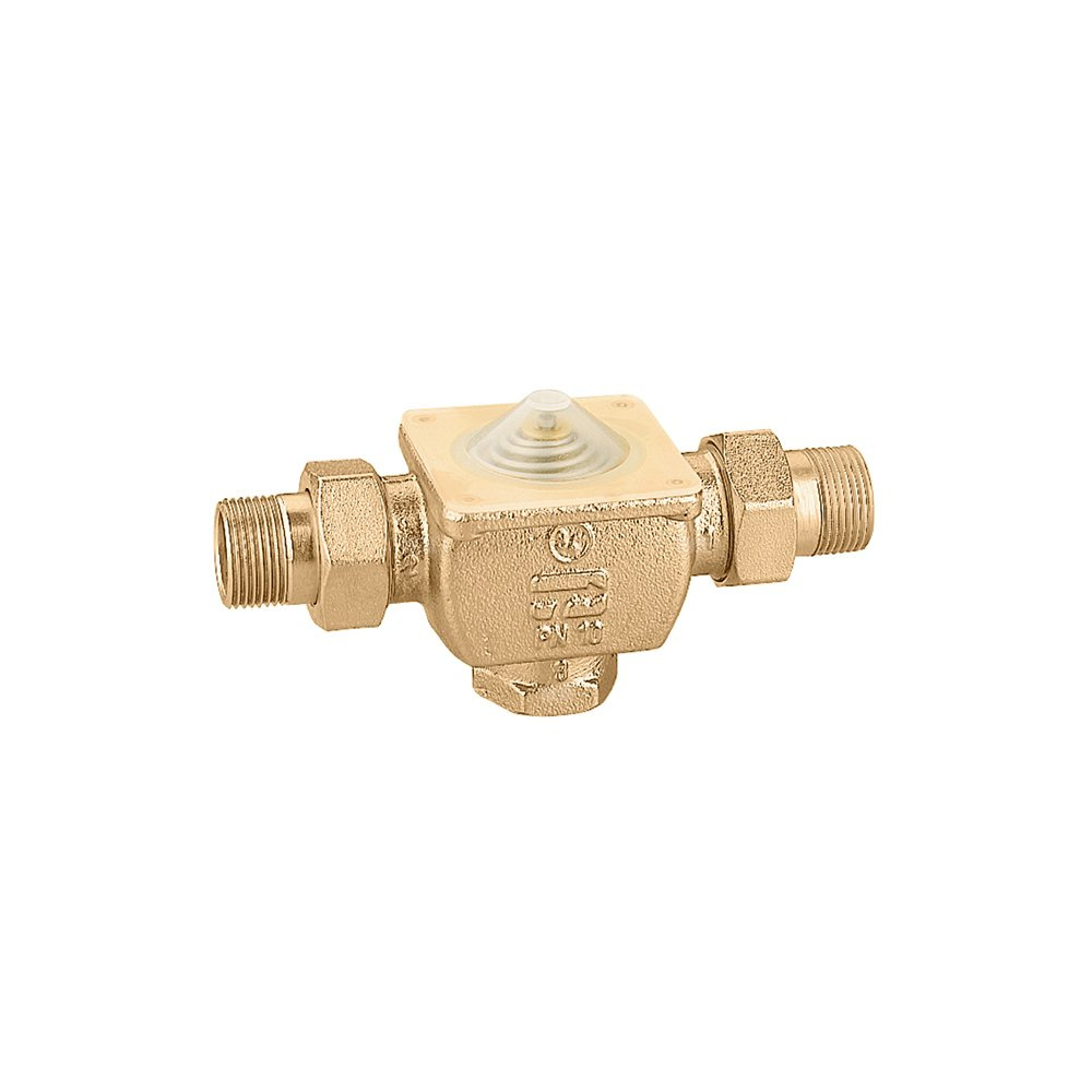 Trójdrożny zawór strefowy, tłokowy Przyłącze: G 1/2" A (ISO 228-1) GZ. Maksymalne ciśnienie pracy: 10 bar. Zakres temperatury medium: -5–95 °C. △p max.: 1 bar. Kv przelot: 4,99 m³/h. Kv obejście: 4,33 m³/h.