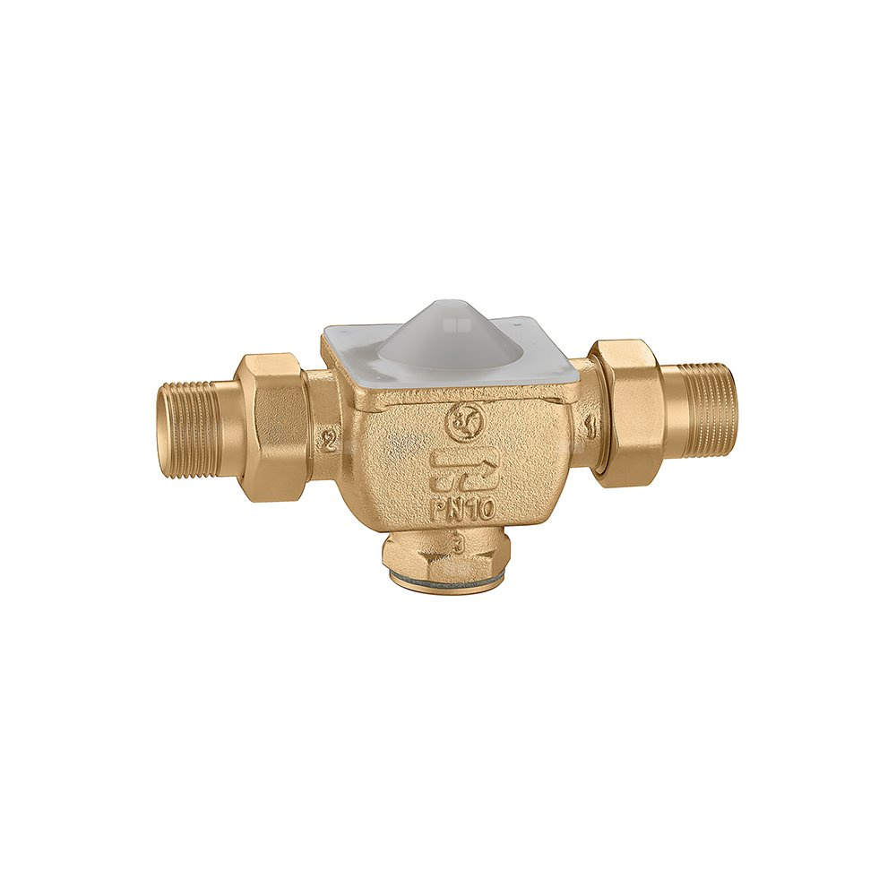 Trójdrożny zawór strefowy, tłokowy Przyłącze: R 1" (EN 10226-1) GZ. Maksymalne ciśnienie pracy: 10 bar. Zakres temperatury medium: -5–95 °C. △p max.: 1 bar. Kv przelot: 6,45 m³/h. Kv obejście: 5,30 m³/h.