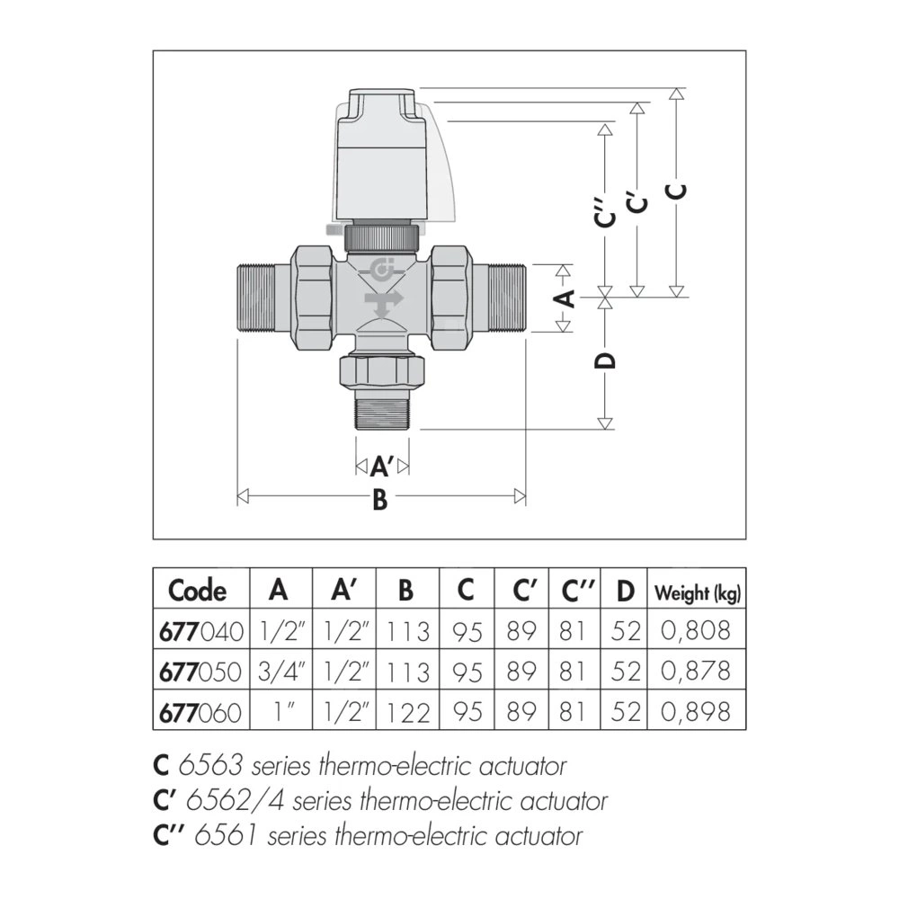Zawór trójdrożny strefowy Przystosowany do siłowników termoelektrycznych serii 6563, 6561, 6562 i 6564. Przyłącze: G 3/4" A (ISO 228-1) GZ. Maksymalne ciśnienie pracy: 10 bar. Zakres temperatury medium: 0–95 °C. △p max.: 1,2 bar. Kv przelot: 3,7 m³/h. Kv obejście: 1,0 m³/h.