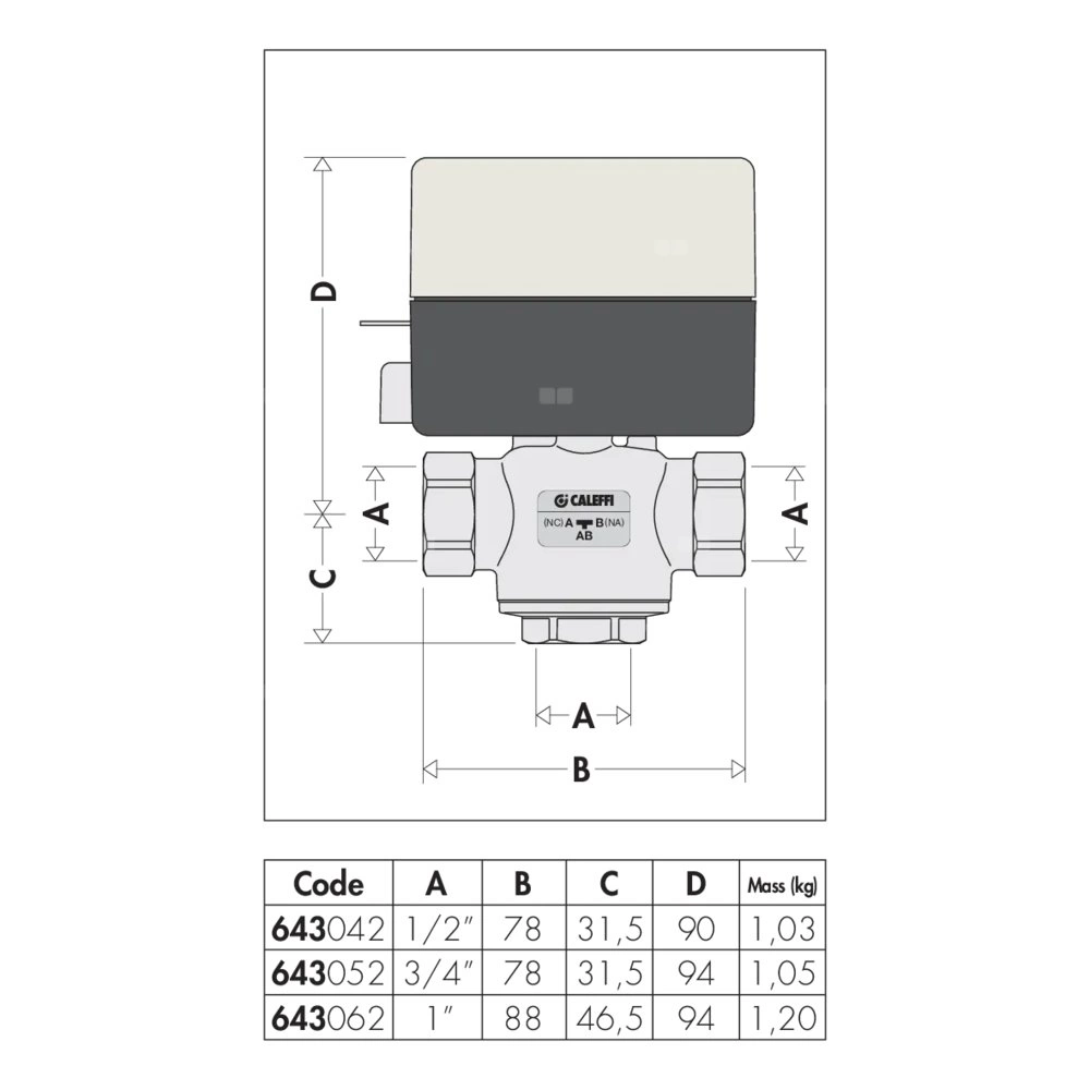 Trójdrożny zawór strefowy z napędem Z mikroprzełącznikiem pomocniczym Normalnie zamknięty. Przyłącze: G 1/2" (ISO 228-1) GW. Maksymalne ciśnienie pracy: 16 bar. Zakres temperatury medium: 0–90 °C. Zakres temperatury otoczenia: 0–40 °C. Zasilanie elektryczne: 230 V (AC). Pobór mocy: 7 VA. Stopień ochrony: IP 20. Długość przewodu zasilająego: 0,95 m. Styk mikroprzełącznika pomocniczego (230 V): 0,8 A. △p max.: 2,10 bar. Kv: 2,5 m³/h. Czas otwarcia: 70–75 s. Czas zamknięcia: 5–7 s.