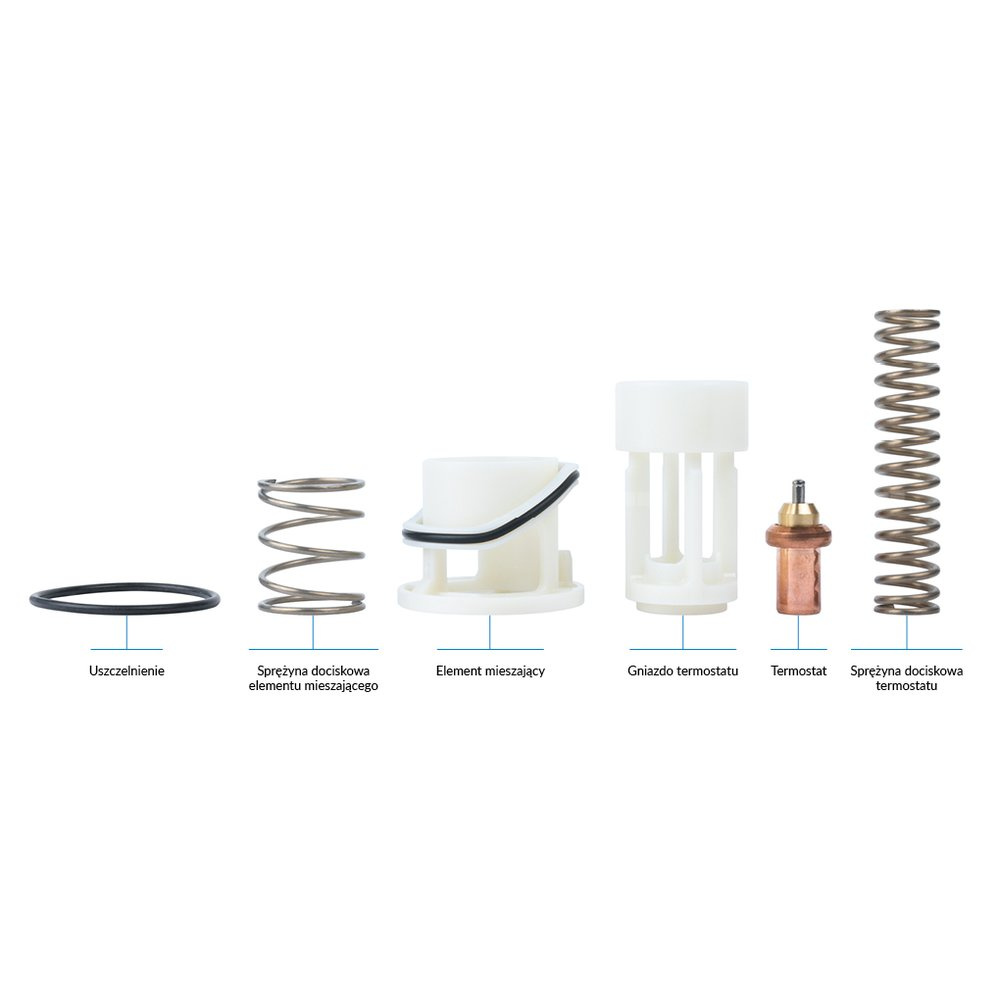 W skład zestawu wchodzą: uszczelnienie, dwie sprężyny dociskowe, wkładka termostatyczna, element mieszający i gniazdo termostatu.