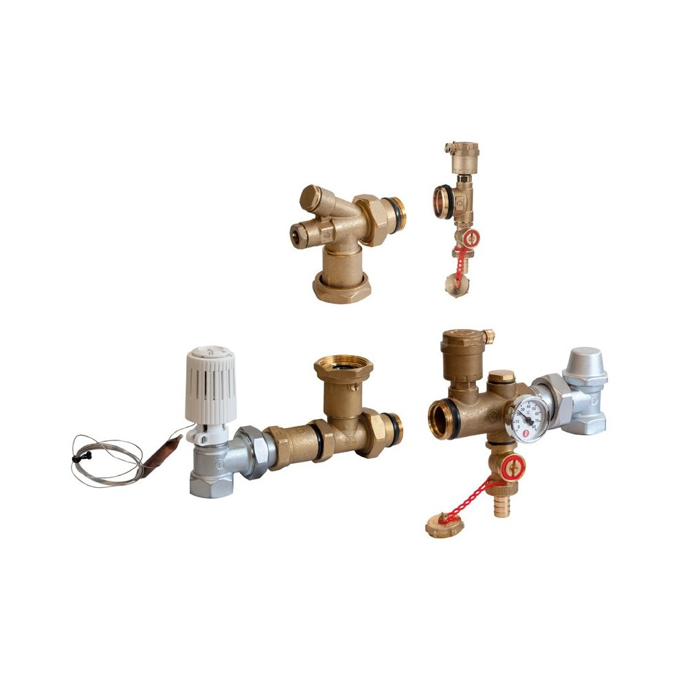 Zestaw do podmieszania dla systemów ogrzewania płaszczyznowego podłogowego zasilanych wodą o wysokiej temperaturze. Mieszanie uzyskuje się po przez głowicę termostatyczną z kapilarą R462L.