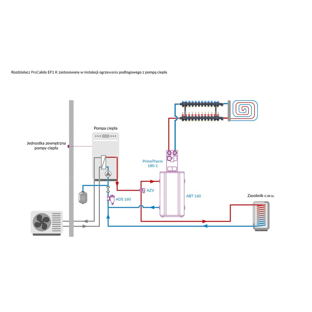 Rozprowadza ciepło / chłód ze źródła na poszczególne pętle instalacji płaszczyznowej.