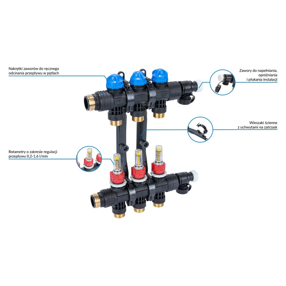 Rozdzielacz do ogrzewania podłogowego AFRISO ProCalida EF1 K 3-obieg. poliamid GZ 1'' x euroconus 3/4'' + przepływomierz + zawór napełn/spust